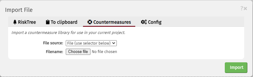 Select Import file from the side menu, and choose the Countermeasures tab. Select the appropriate library file, and click the Import button.