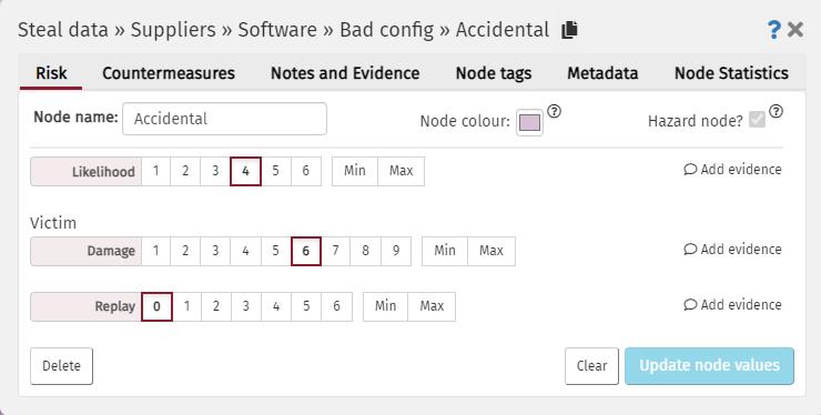 Existing nodes can be converted between attack and Hazard states by selecting Edit node from the node menu and changing the Hazard tickbox. You cannot convert some nodes: