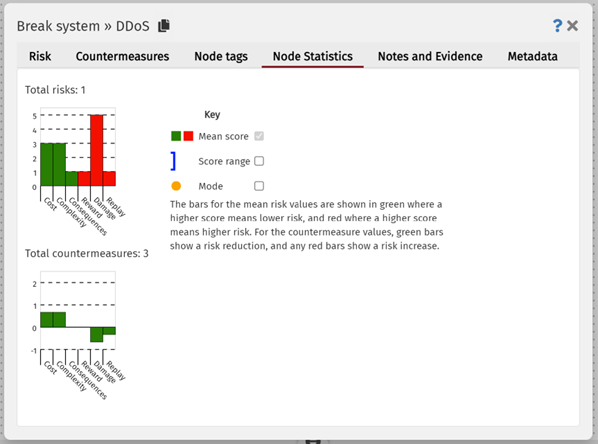 The Node Statistics tab contains information about the risks and countermeasures for the selected node and all of its children presented graphically.