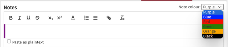 The note editor is WYSIWIG, so you can see your text formatting. It provides the following functions (from left to right on the toolbar):