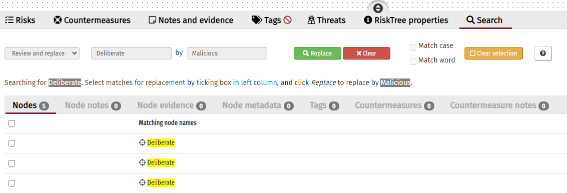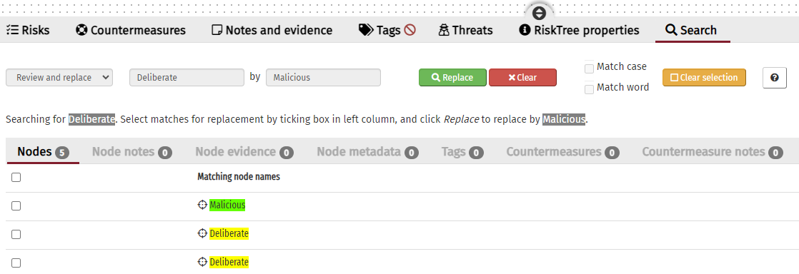 The search tab is used to find and replace information in your RiskTree. The search is run across node names, node notes, node evidence, note tags, node metadata, countermeasure names, and countermeasure notes.