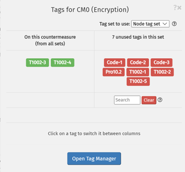 Multiple tag sets can be used at the same time. To change the tag set in use, select from the drop-down above the right-hand panel. You will only be able to see tag sets that relate to the entity type that you are editing (i.e., Nodes or Countermeasures).
