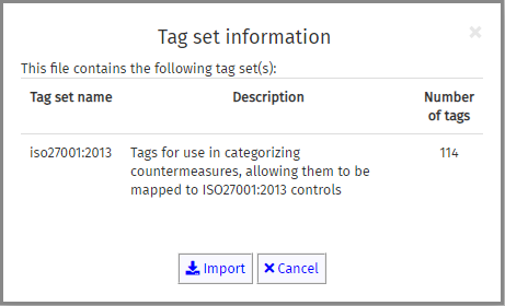 By default, this will let you load a file from your computer by clicking on the button. If you have a premium account, the drop-down will also show pre-built tag libraries. Choosing one of these will remove the Choose file button. Make your selection, and click on the button. The tag set will be checked, and a pop-up box will tell you how many tags are in the set. If you wish to continue loading them, click on the Import button and they will be loaded into RiskTree and be available for you to use.