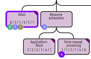 The toggle switches highlight any node that has the relevant tag with a thick purple border, and any countermeasure with a large purple disc, as shown for the DDoS node and CM4 below: