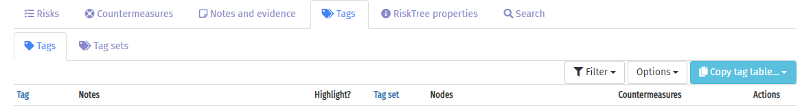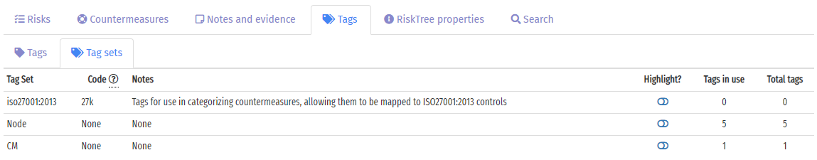 The Tags tab, below the RiskTree, shows details of the tags and tag sets in use on your RiskTree. To see the tags, click on the Tags sub-tab. This lists all of the tags that are in use (i.e., have been applied to at least one node or countermeasure).