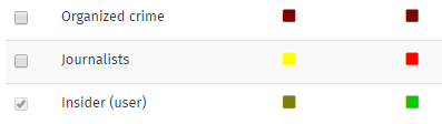 If a threat has already been selected on a node higher up the tree from the currently selected node, you will see that it is already ticked, and the checkbox is disabled, preventing you from unticking it - it has been 'locked' on. This is because threats affect every child node as well as the node on which they have been chosen. In the example below, the 'Insider (user)' threat has been locked.
