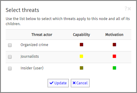 You can select the threat(s) appropriate to this tree branch (i.e., this node and all of its children) by ticking the checkbox to the left of the threat name. The coloured squares to the right of the name give you a quick view of the Capability and Motivation of the threat.