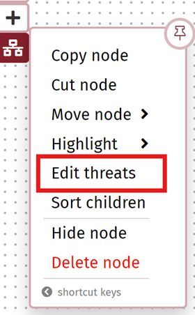 To assign a threat source / actor to a node, select the Threats option from the node menu: