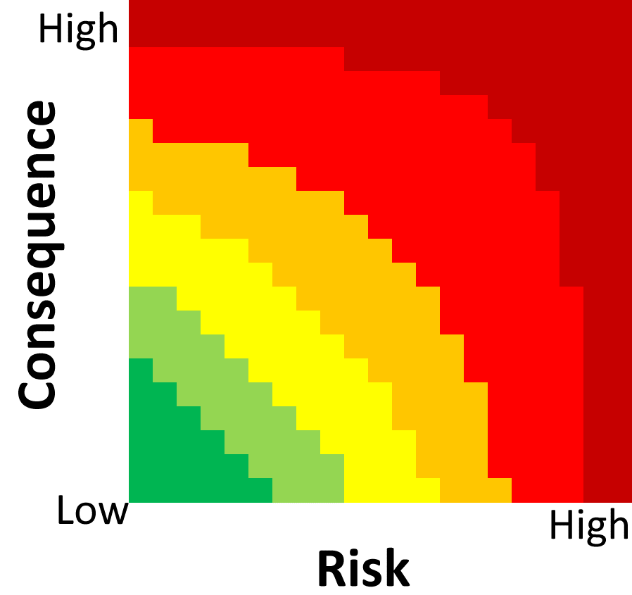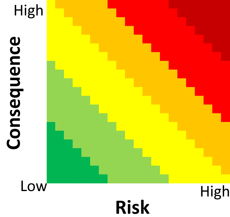 This assessment type takes the average (mean) of the worst risk score and the worst consequence score, and scales the result into the range 0 – 100. This might be appropriate for an organization with a risk appetite of Cautious.