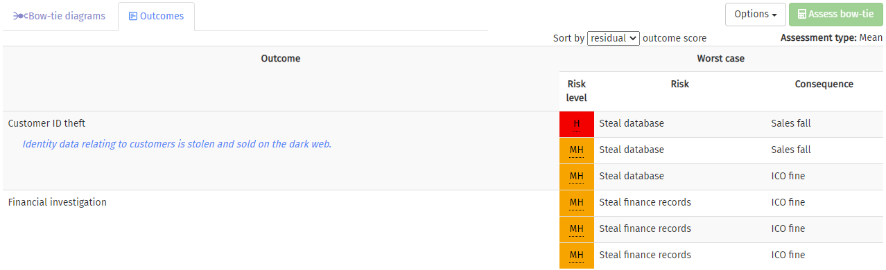 Once the bow-tie diagrams have been assessed, the outcomes table will be populated. This is on the  Outcomes tab. It shows the outcomes, sorted from highest to lowest, in a table. The type of assessment used for sorting is shown, and can be changed, using the drop-down above the table. For each outcome, the intrinsic, residual, and target assessments are shown, together with the worst case risk and consequence for each level. The type of assessment that was used is shown above the table, below the assessment button.