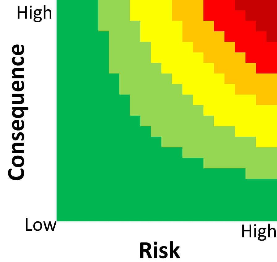 This assessment type is the inverse of 'open', and works by multiplying the inverse of the worst risk score by the inverse of the worst consequence score, inverting the result, and then scaling the result into the range 0 – 100. This provides a more typical view of risk, so that if either the risk or consequence is high then the result will be high; in other words, it skews high. This might be appropriate for an organization with a risk appetite of Minimalist or Averse.