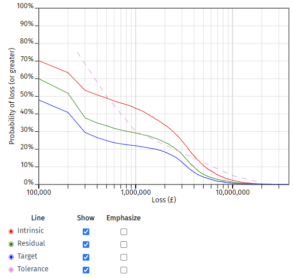 The chart has a logarithmic x-axis, showing the loss. The intrinsic, residual, and target values are shown in red, green, and blue curves respectively. Any point on curve shows the minimum probability (y-axis) of the loss (x-axis). For example, in the chart shown above, for a loss of £1 million, the intrinsic probability is 43%, the residual is 29%, and the target is 23%.