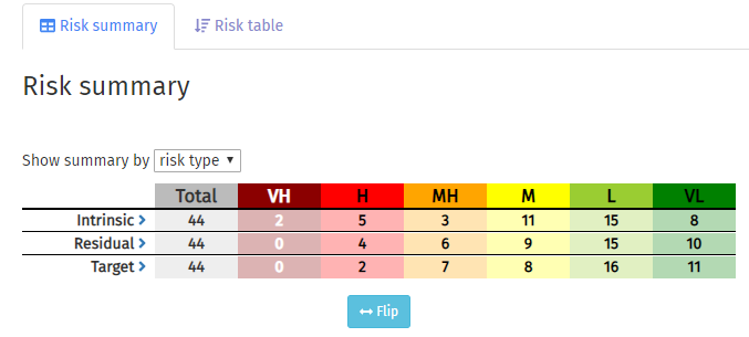 The risk summary provides a breakdown of your assessed risks by risk type (intrinsic / residual / target) and by RiskTree (if you have loaded multiple trees into the Processor).