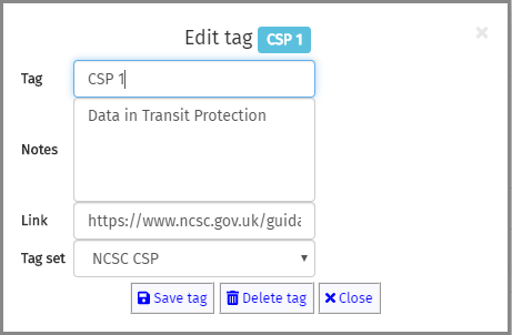 Make any changes that you need to the tag information, including changing the name or the tag set to which it belongs, and then click Save tag to confirm your changes. Clicking the Close button will lose any changes that you have made.