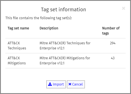 Select the Load tag files tab. By default, this will let you load a file from your computer by clicking on the button. Make your selection, and click on the button. You will see a pop-up box describing the tag sets in the file; this gives details of the tag set name, any notes and links for them, and the number of tags that they contain: