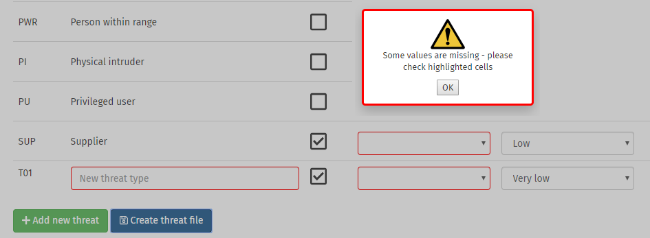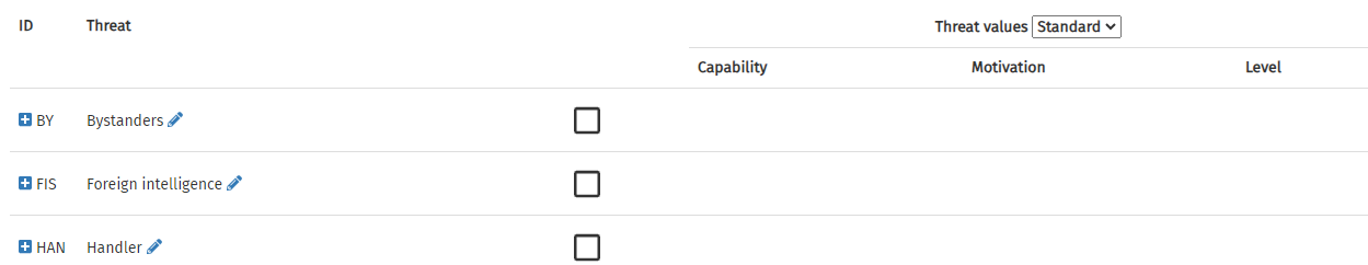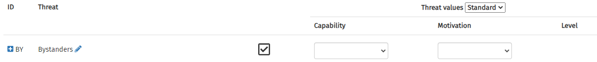In order to add a threat, click on the appropriate row. The checkbox will be ticked, and input fields will appear in the Capability and Motivation columns.